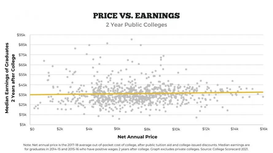 Price vs. Earnings (2 Years after Graduating) – 2 Year Colleges